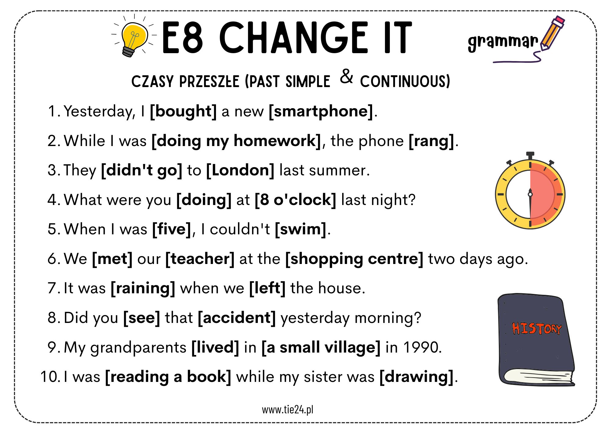 E8 CHANGE IT to autorski zestaw 260 zdań, który rewolucjonizuje powtórki. To nie jest kolejny nudny zbiór testów – to interaktywne narzędzie do budowania pewności językowej!